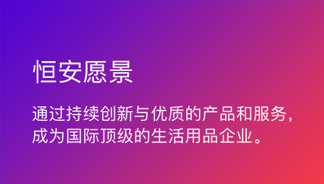 恒安堅持“誠信、拼搏、創(chuàng)新、奉獻”的精神,以“追求健康,你我一起成長”為使命,通過持續(xù)的創(chuàng)新與優(yōu)質(zhì)產(chǎn)品服務(wù),致力成為國際頂級的生活用品企業(yè)。